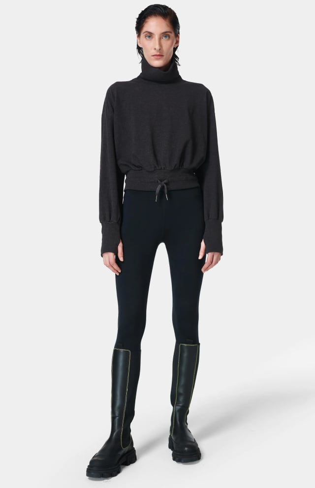An adjustable drawstring cinches the wide hemline of this comfort-first fleece pullover with a slouchy turtleneck and thumbhole cuffs.